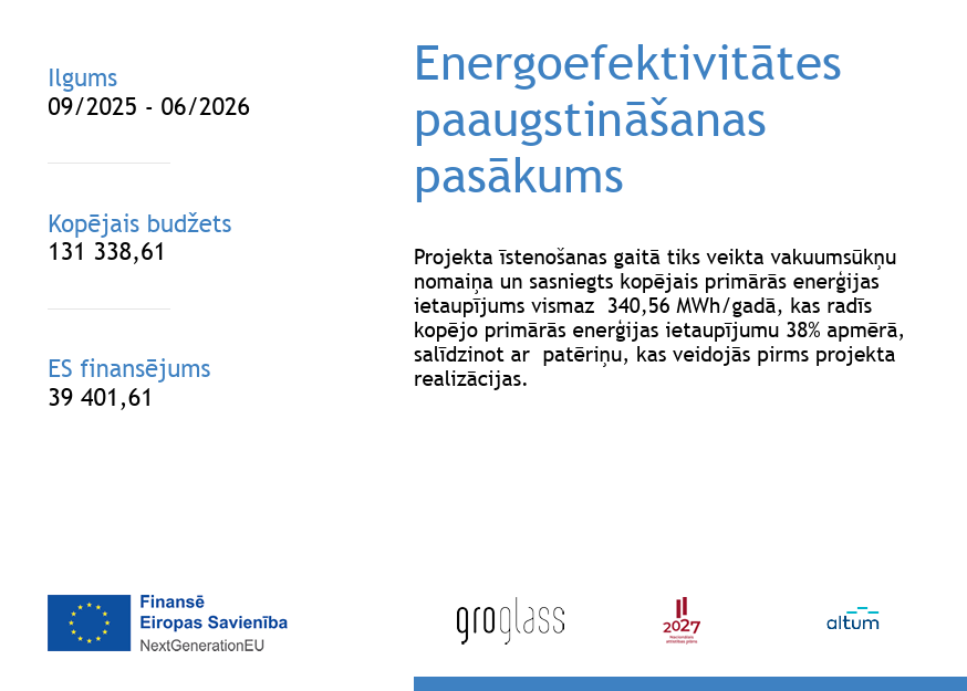 2025.gada 25.septembrī SIA GroGlass un AS Attīstības finanšu institūcija Altum parakstīja aizdevuma līgumu par SIA GroGlass vakuumsūkņu nomaiņu energoefektivitātes uzlabošanai. Paredzams, ka pēc aizdevuma līgumā paredzēto pasākumu realizācijas tiks sasniegts enerģijas ietaupījums vismaz 340,56 MWh/gadā. Aizdevuma līgumā paredzētās darbības plānots īstenot 2026.gada pirmajā pusē.